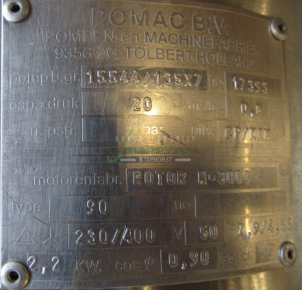 SS 316 Centrifugal pump, Pomac, 1S544/135×7 CP/KAM